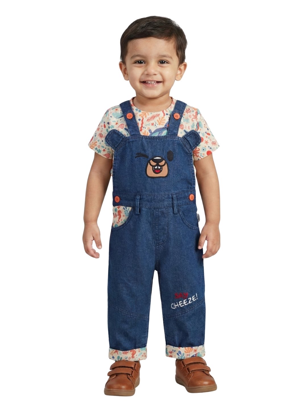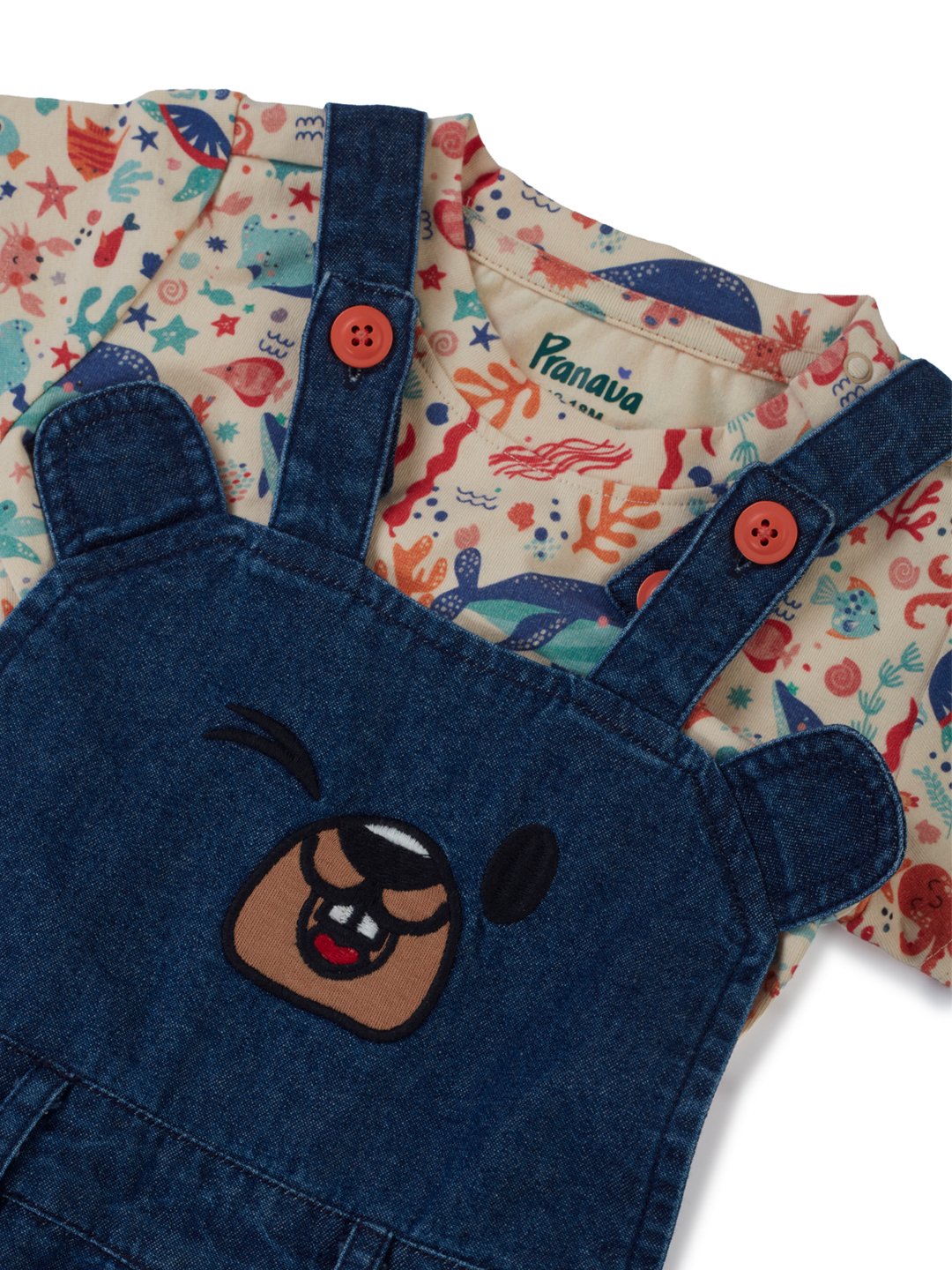 Keep your little one cute and comfortable with this adorable Pranava Organic Cotton Dungaree Set. The set includes a soft printed organic cotton half-sleeve t-shirt paired with a denim-look organic cotton dungaree. Featuring playful bear applique detailing, adjustable shoulder straps, and snap button closures for easy diaper changes, this outfit is perfect for everyday play, outings, and picture-perfect moments.