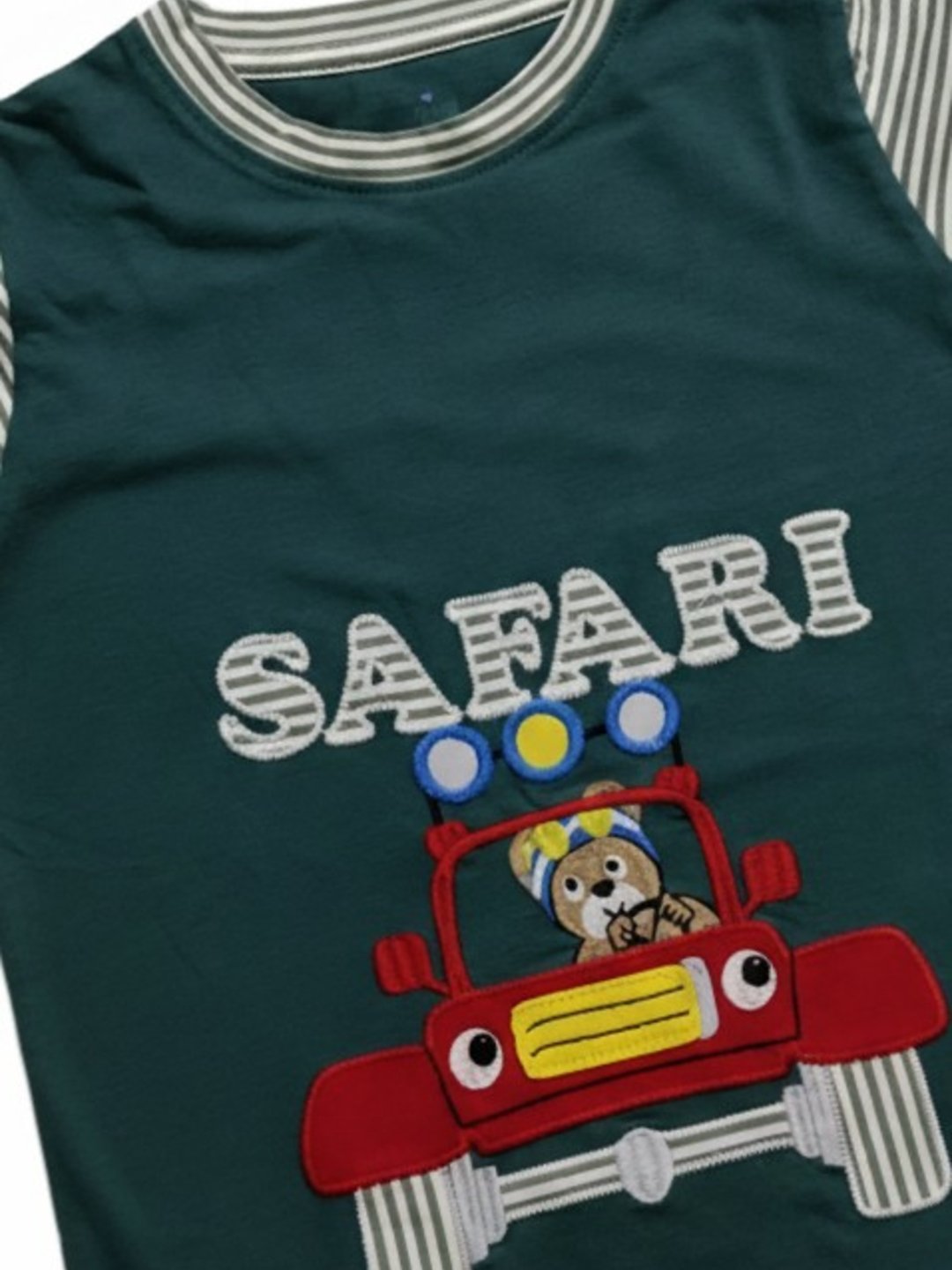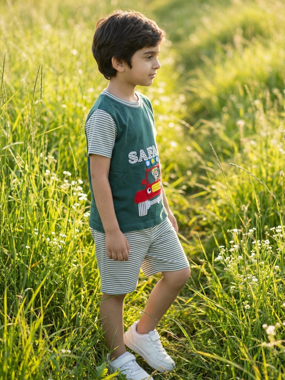 Boys Organic Cotton Single Jersey Short Sleeve Safari Vehical Applique T-Shirt & Shorts Set – Green