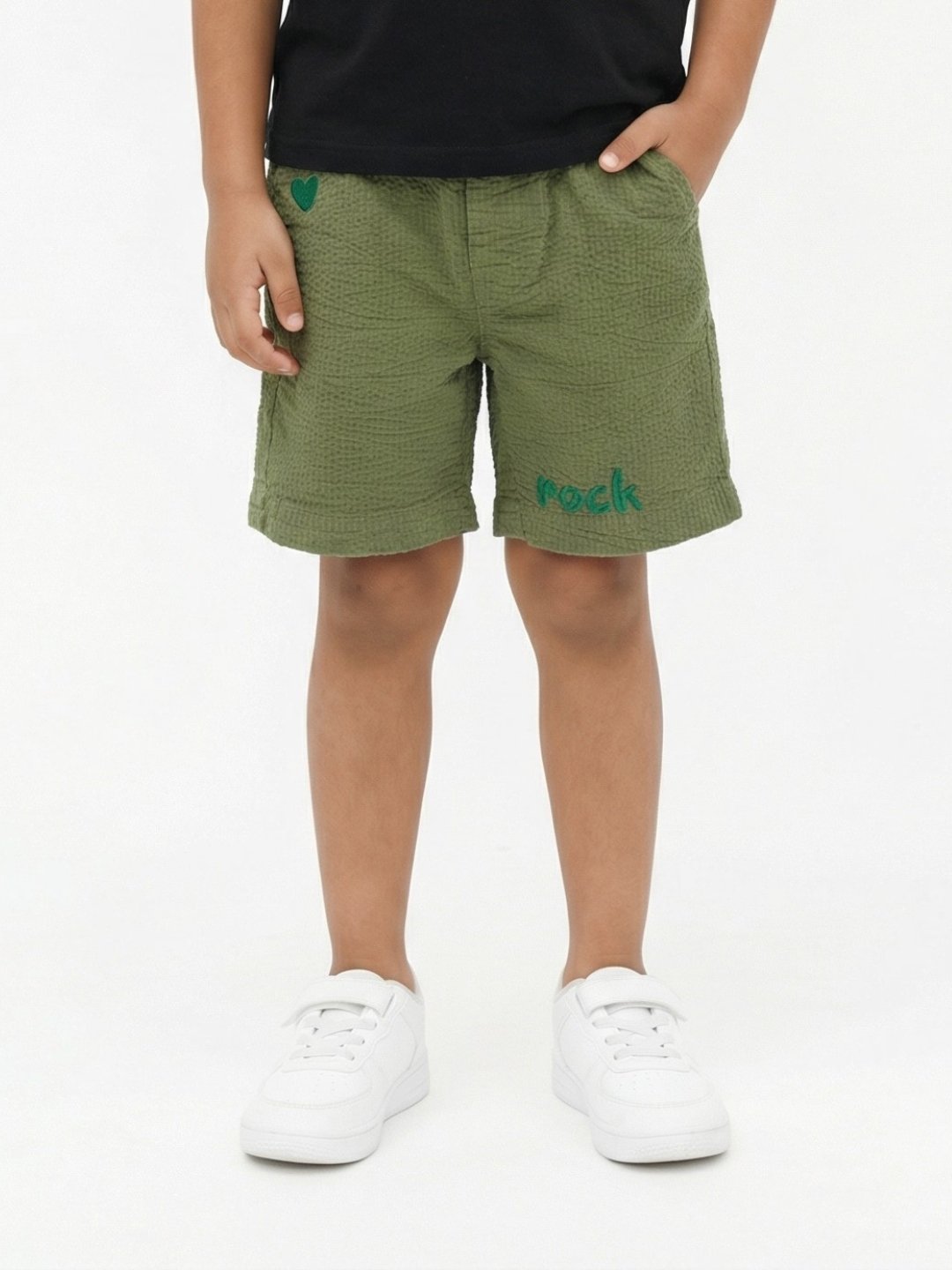 Boys Organic Cotton Seer Sucker Knee Length Rock Embroidered Shorts – Green