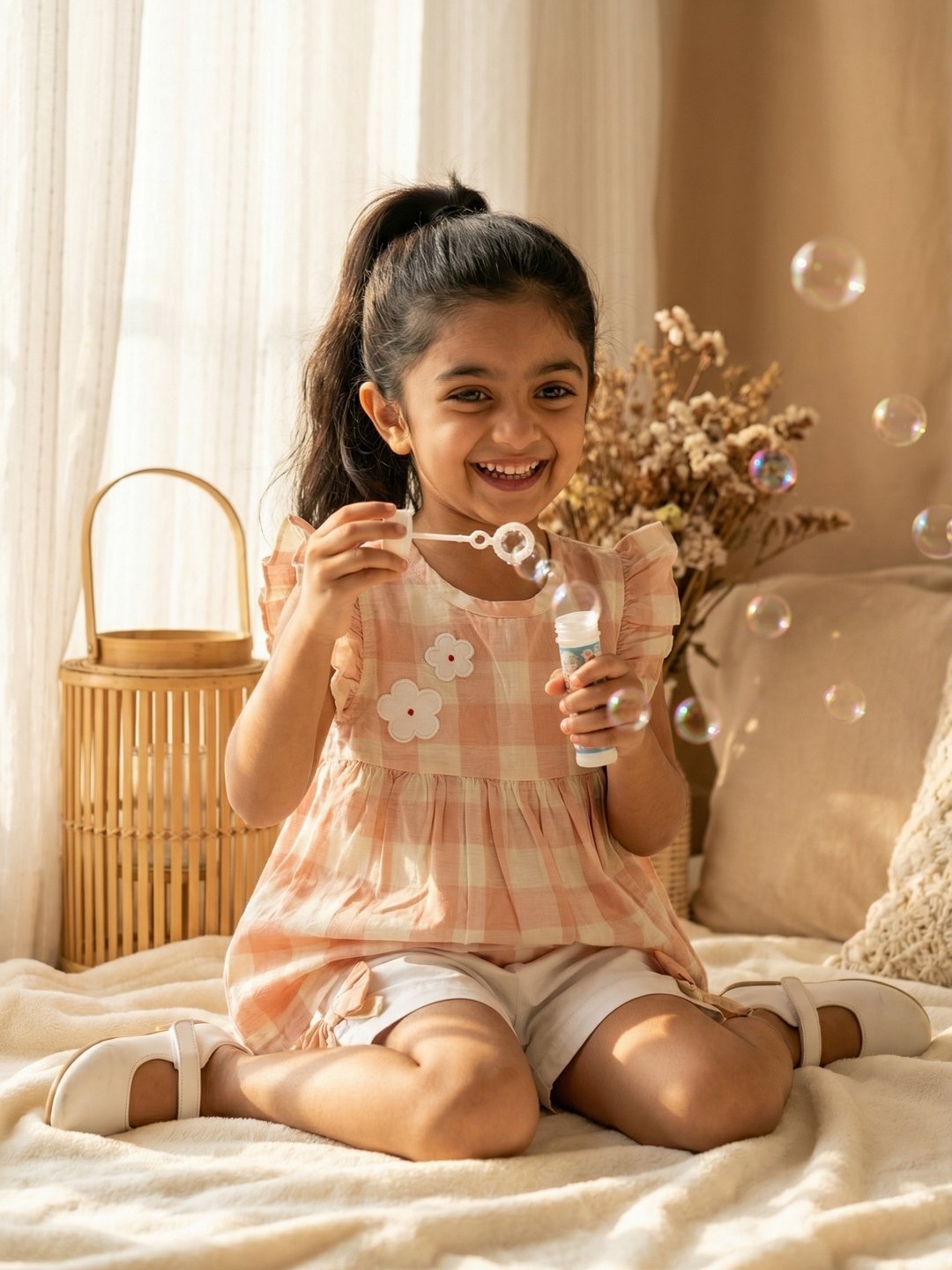 Girls Organic Cotton Checks Sleevless Flowers Applique Top & Shorts Set – Pink
