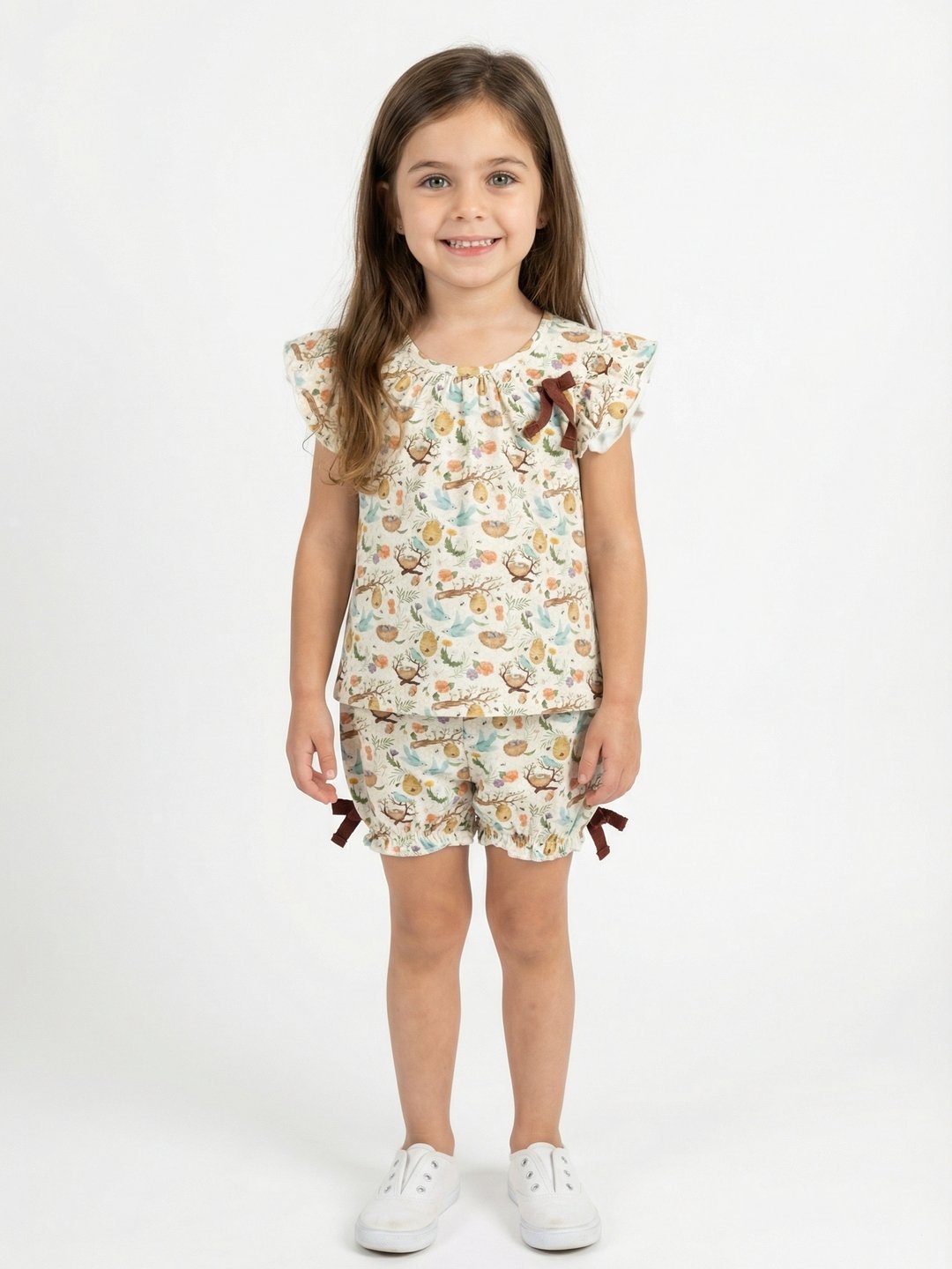Girls Organic Cotton Single Jersey Sleevless All Over Print Top & Gathered Shorts – White & Green