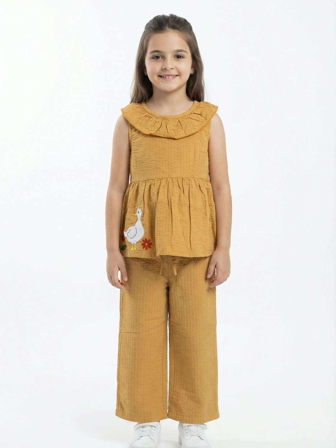 Girls Organic Cotton Seer sucker Sleev Less Duck Embroidered Frill Top & Pant set – Yellow