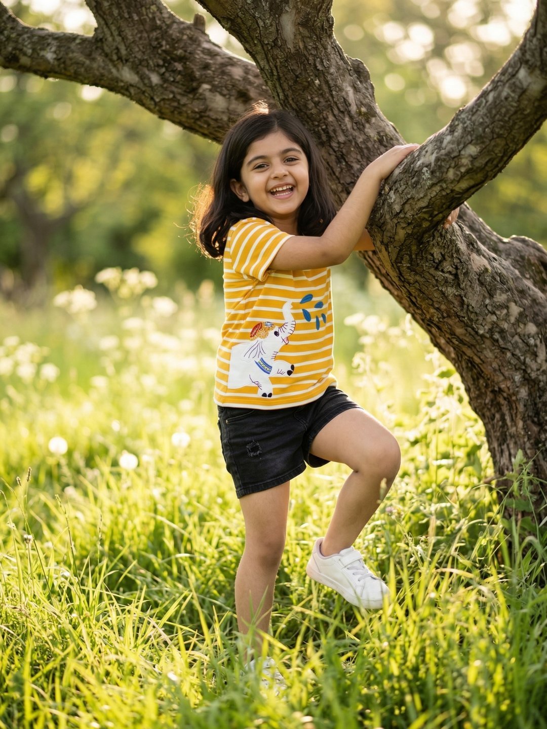 Girls Organic Cotton Interlock Short Sleeve Stripe & Elephant Print Top – Gold