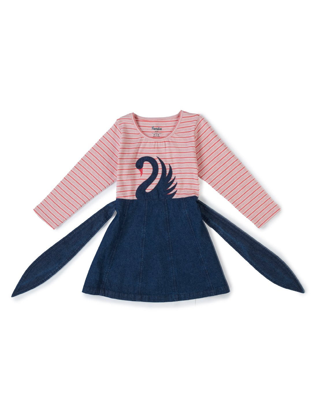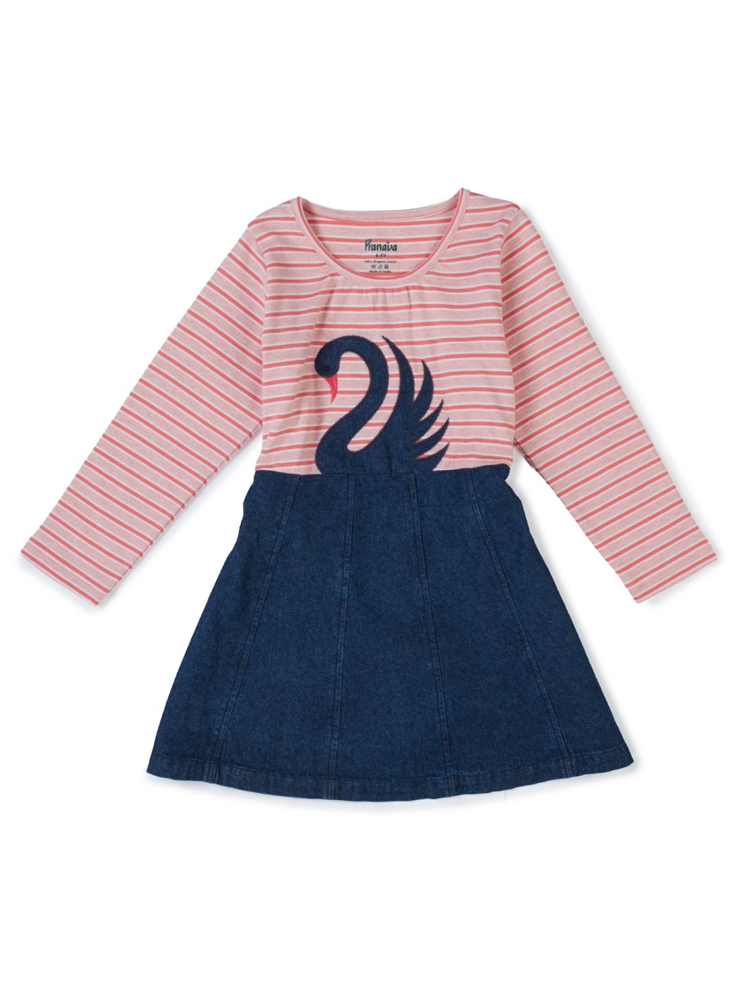 Let your little one step out in graceful style with Pranava Organic Cotton Dress. Designed using soft organic cotton knit for the top and denim-look organic cotton for the skirt, this dress offers superior comfort and gentle care for sensitive skin. Featuring charming stripe patterns, a beautiful swan applique, and stylish tie-up detailing at the waist, it is perfect for casual outings and special day wear.