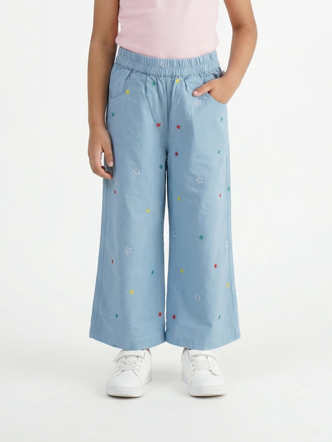 Girls Organic Cotton Poplin Ankle Length Stars Pant – Blue