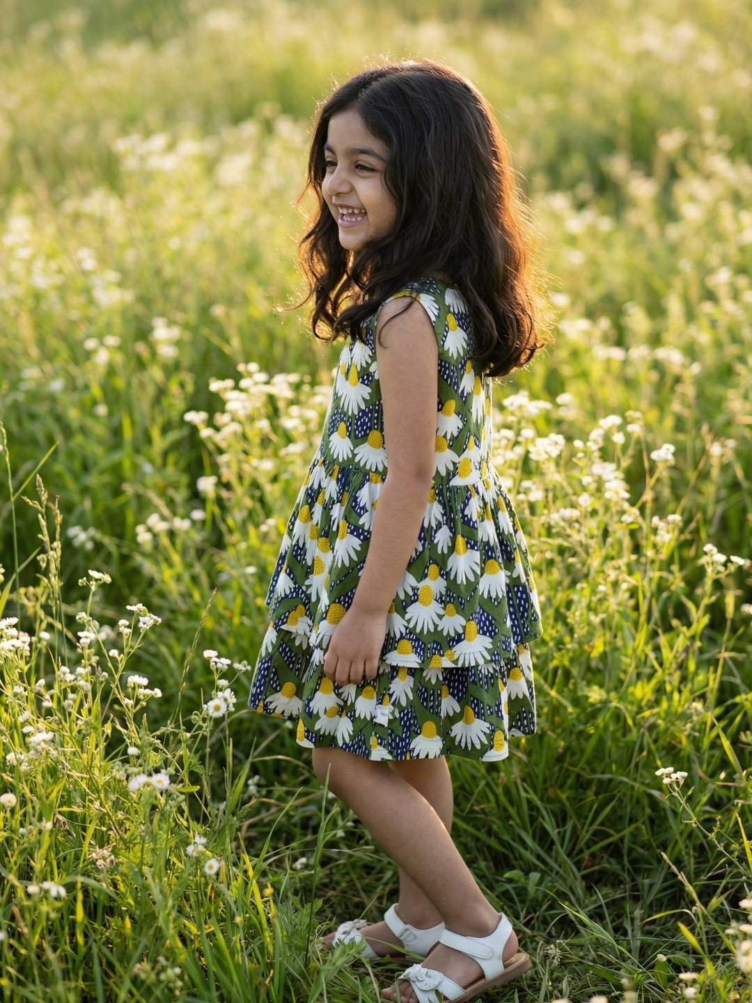 Girls Organic Cotton Poplin Sleevless Flower All Over Print Dress – Navy