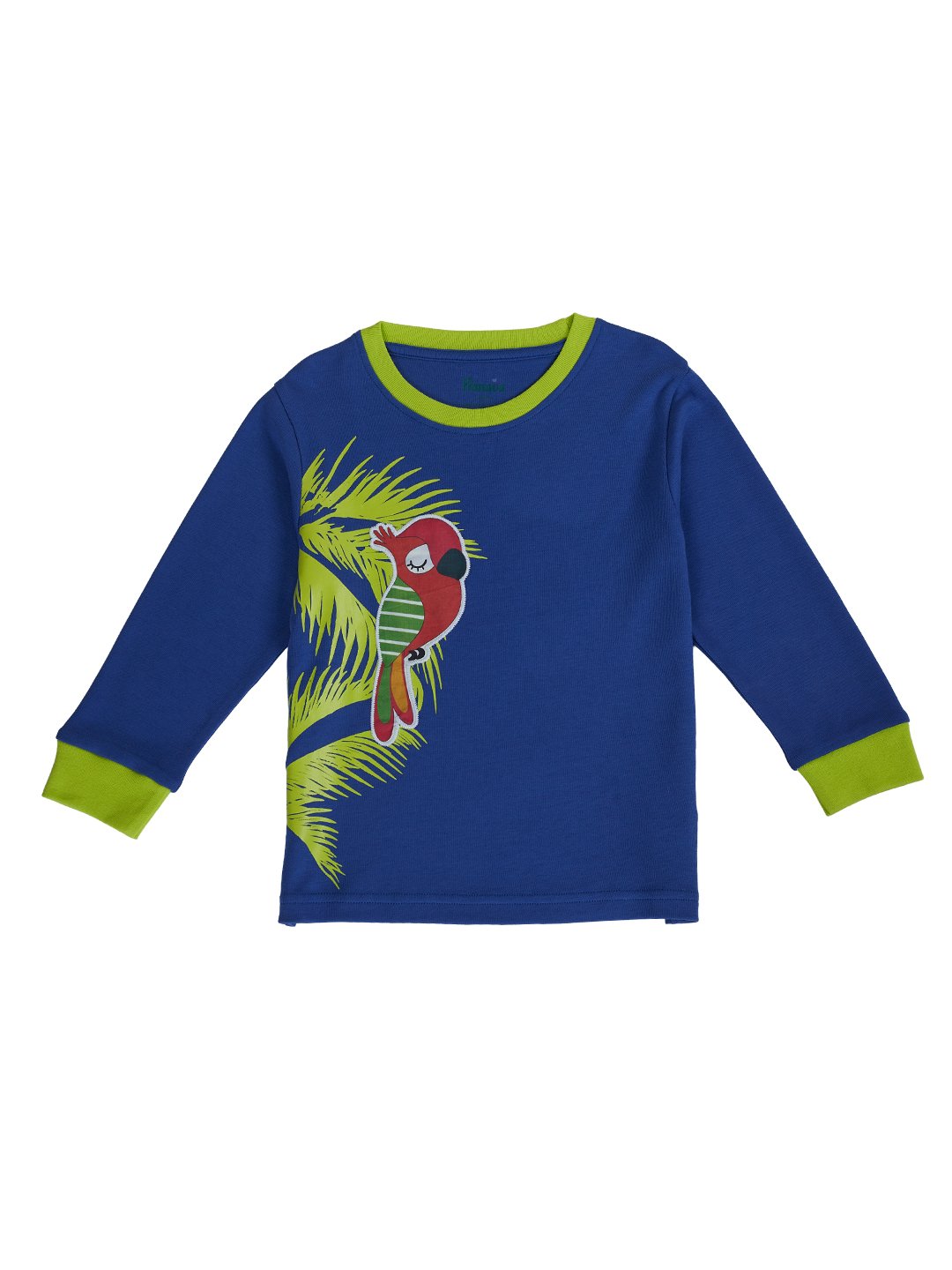 Pranava Boys Organic Cotton Interlock Full Sleeves Tropical Print With Parrot Applique T-Shirt – Blue Tang