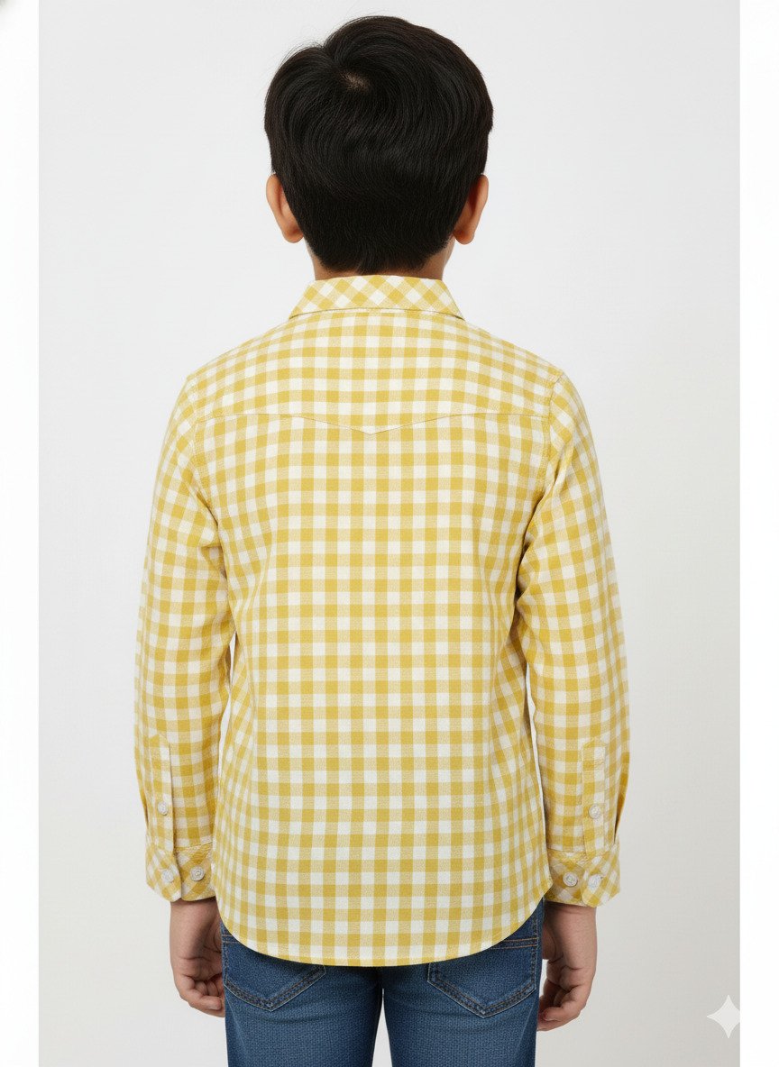Dress your little man in timeless style with our charming Mustard Yellow Gingham Check Shirt. This piece perfectly blends classic design with playful, modern details, making it a must-have for his wardrobe.