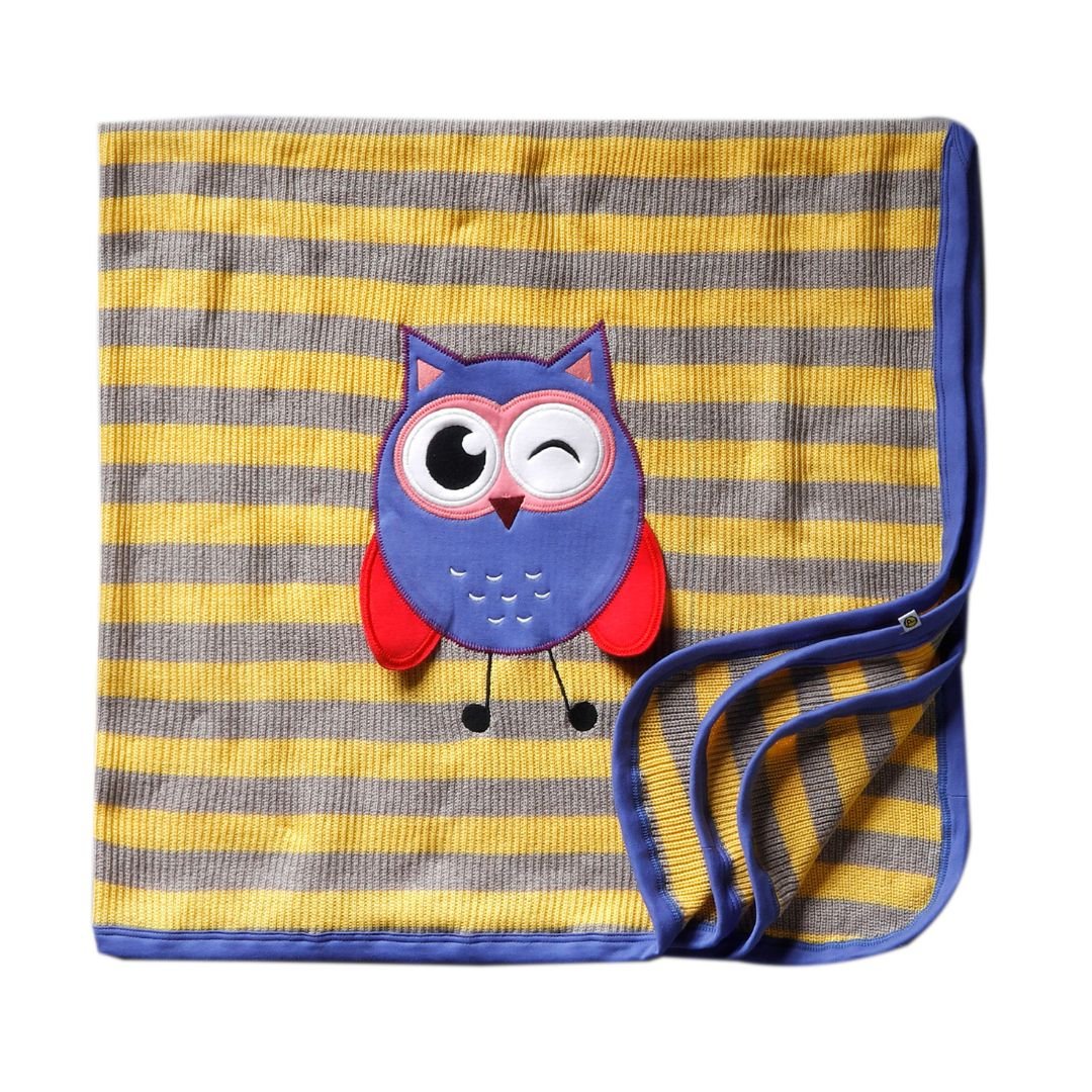 Unisex Embroidered 100%Organic Cotton stripes Owl Graphic warm Baby Blanket-Grey and Yellow