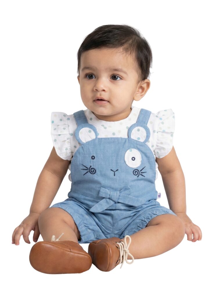 Girls Organic Cotton Knits Sleeveless With Frill Polka Dot Top With Cute Bunny Face Dungaree – Blue & White